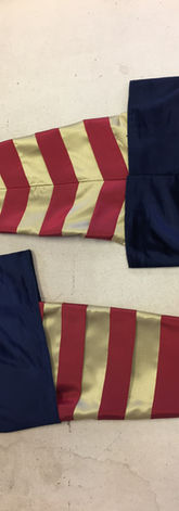 The navy blouse wave made of a poly velvet and the gold and red stripes of taffeta. 50 stars were hand sewn on across the exposed navy areas.